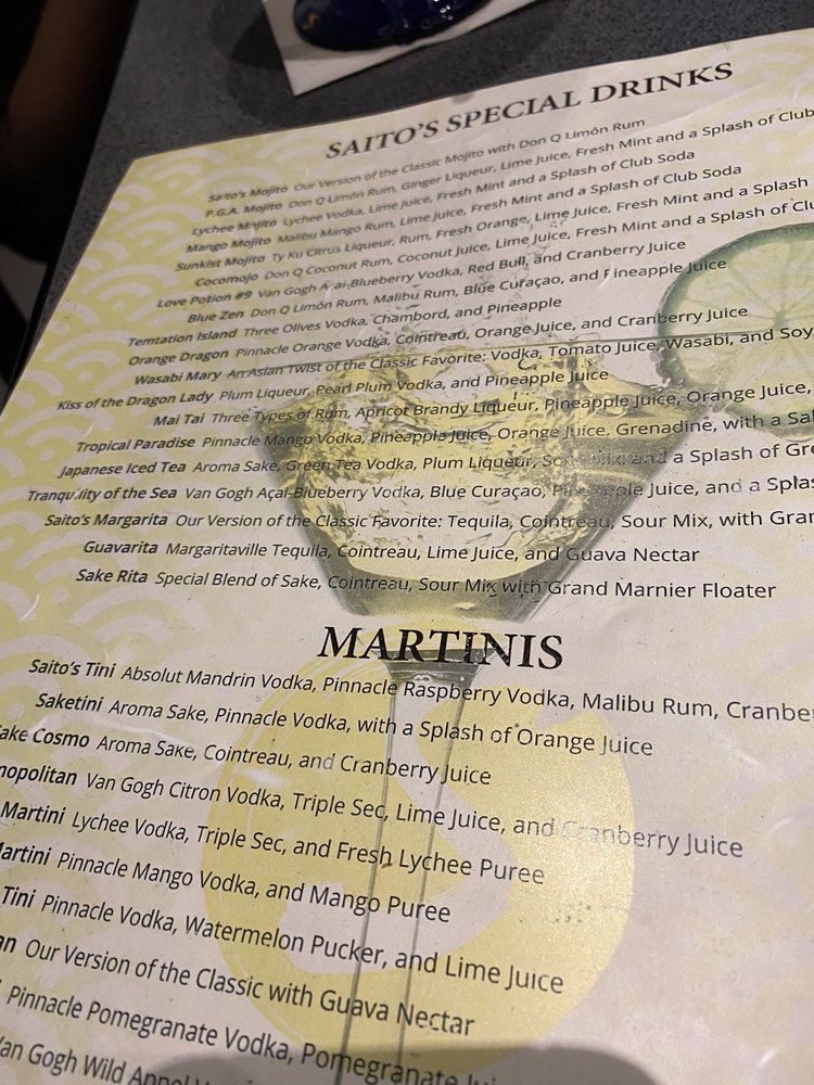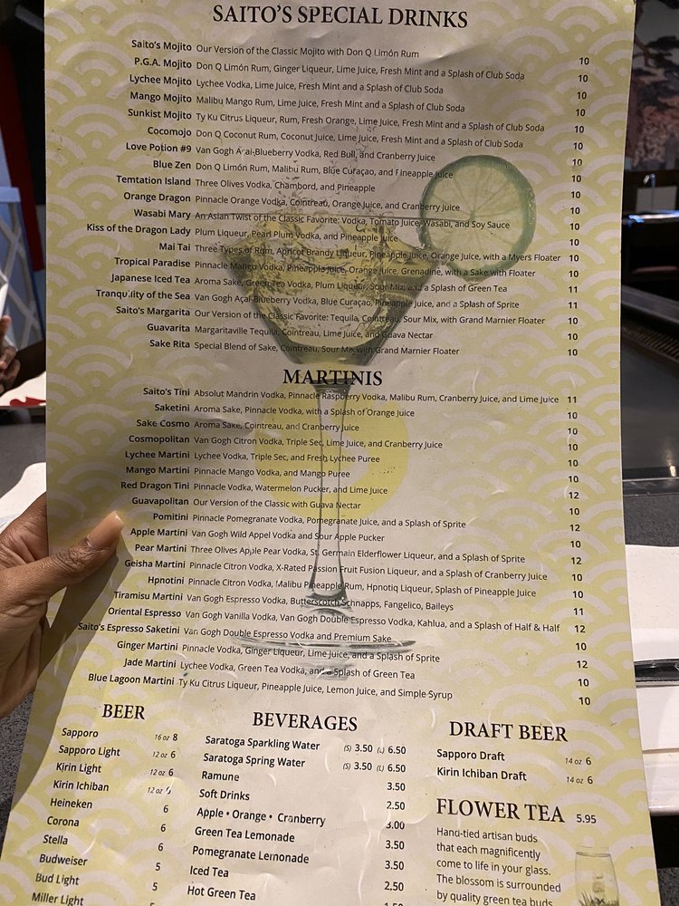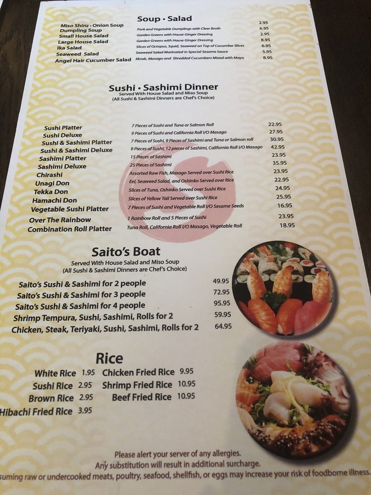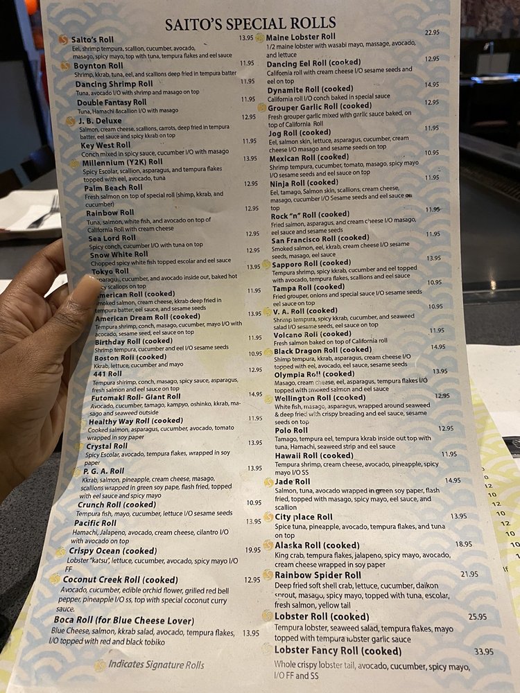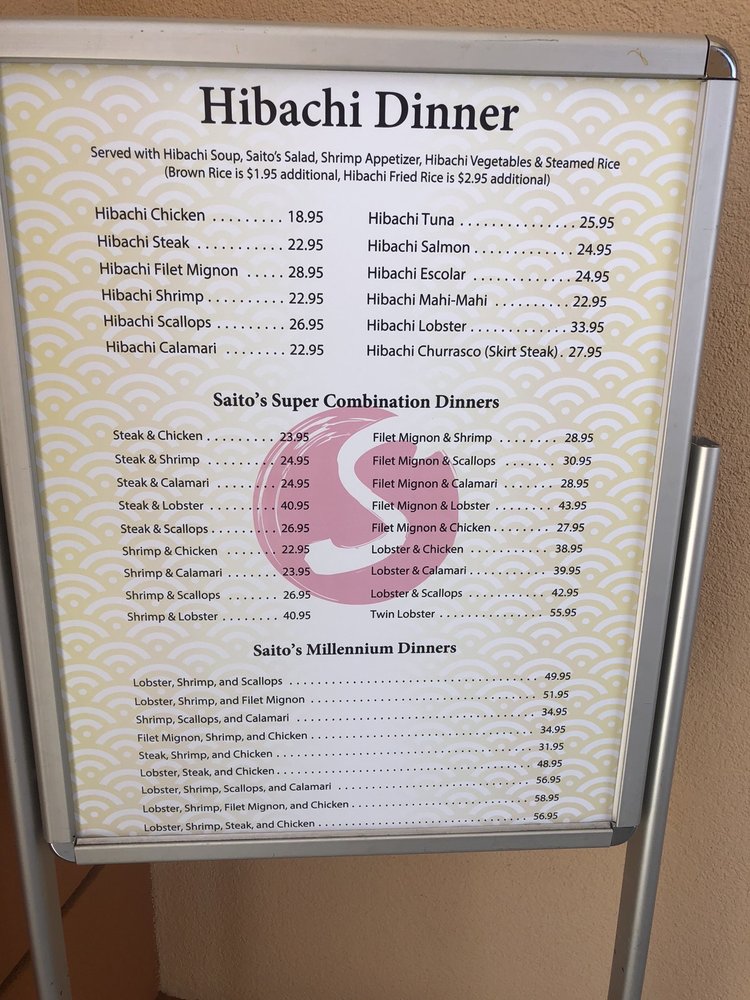 Introducing the menu at Saito’s - Pompano, a Japanese steakhouse located in Pompano Beach, FL, offers a unique dining experience. Customers rave about the fantastic food, great customer service, and lively hibachi cooking. The hibachi cook entertains guests with his energy and humor while preparing delicious dishes like shrimp tempura, lobster, and special sauces. The portions are generous, with customers often leaving with leftovers. The restaurant pays attention to food allergies and provides a variety of options, from chicken and steak hibachi meals to hibachi lobster. The cleanliness, friendly environment, and strong alcoholic beverages add to the overall appeal. Whether you're looking for a fun night out or a special celebration, Saito’s - Pompano promises a memorable dining experience.